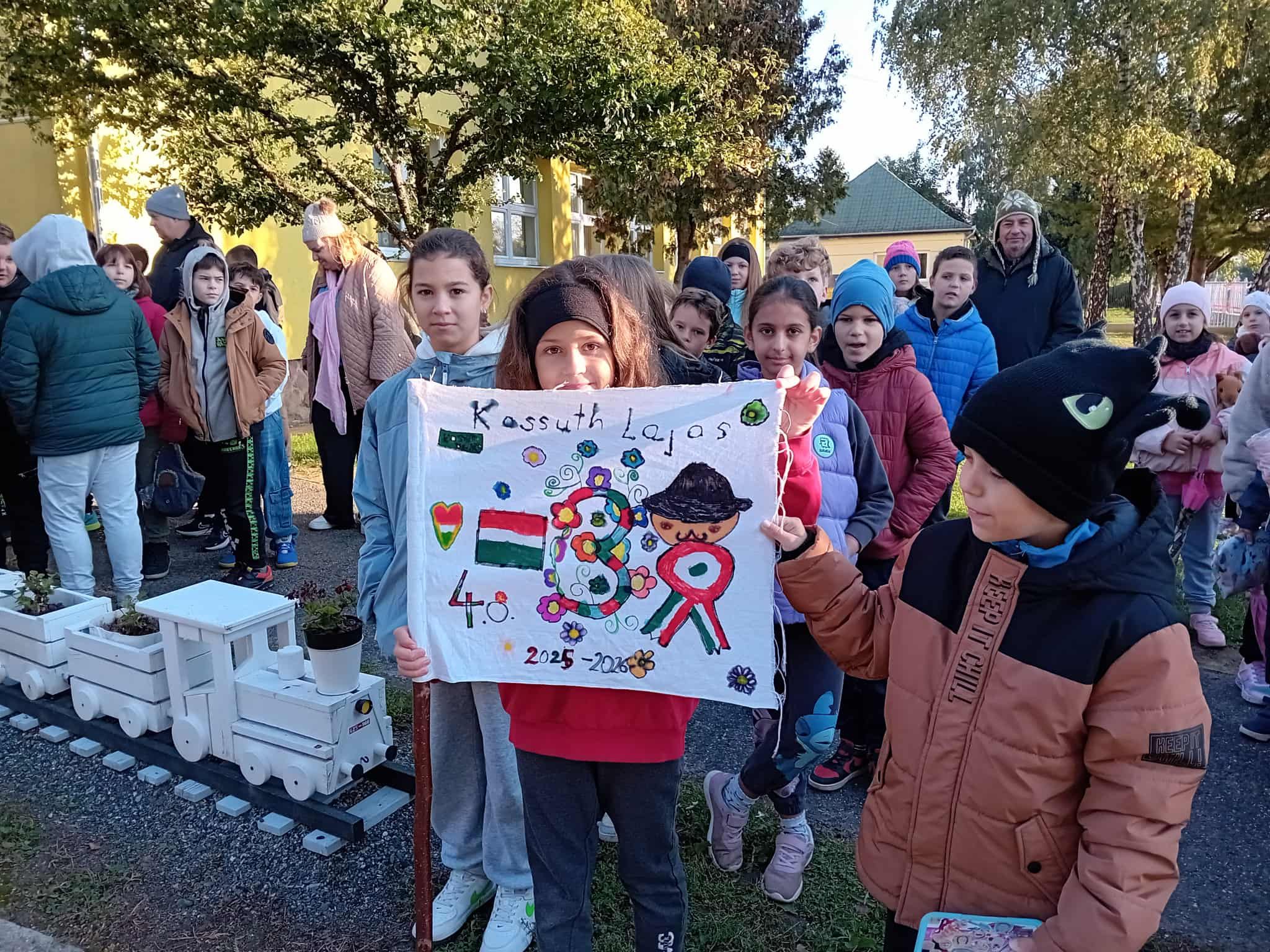 Iskolai hagyományainkhoz hűen idén október 3-án tartottuk meg az iskola névadójának az ünnepségét. Programjainkkal is követtük a korábbi évek műsortervét. A napot nyolcadikosaink kezdték Kossuth életrajzának ismertetésével, ezt követte a koszorúzás. Kossuth-futás keretében 1802 m-t tettünk meg a faluban rendőri biztosítással, esernyőkkel. Tízórai szünet után kezdődött a nemes versengés az osztályok között. A helyszíneken pontot gyűjthettek pontos labdagurításért, lufi durrogtatásért, kvíz feladat megoldásáért, puzzle kirakásáért. Érzékenységet fejlesztő játék keretében a szabadságharchoz kapcsolódó kifejezéseket kellett kitalálni. Labdákat raktunk egyik helyről a másikba, négy levelű lóheréket kerestünk időre. Vizes poharak áthelyezése, sok-sok vidám feladat tarkította a napot. A tornaterem is funkcionált helyszínként, csak a magunk szórakoztatására egy kis Ninja Warrior pályán mérettethettük meg magunkat.