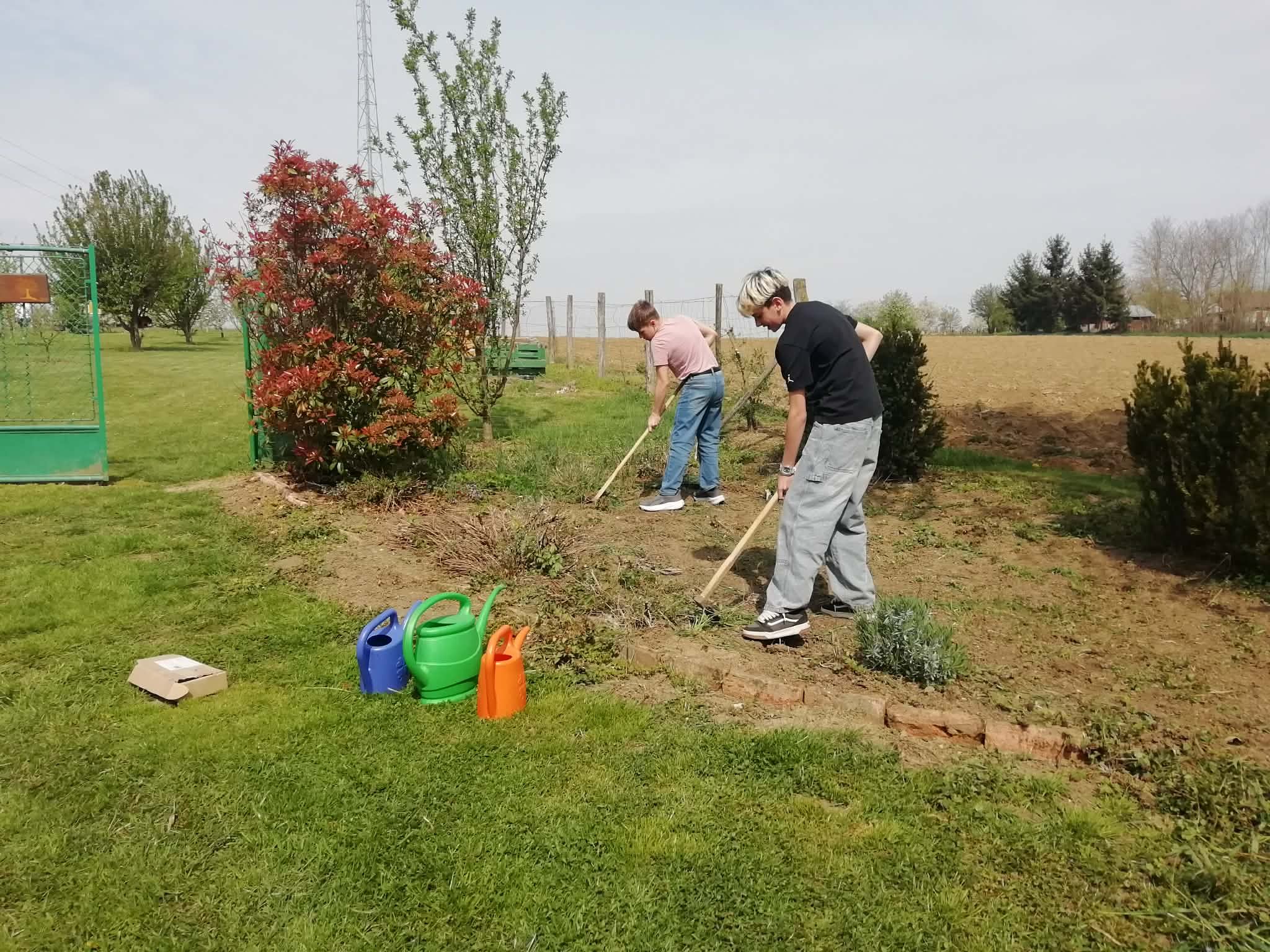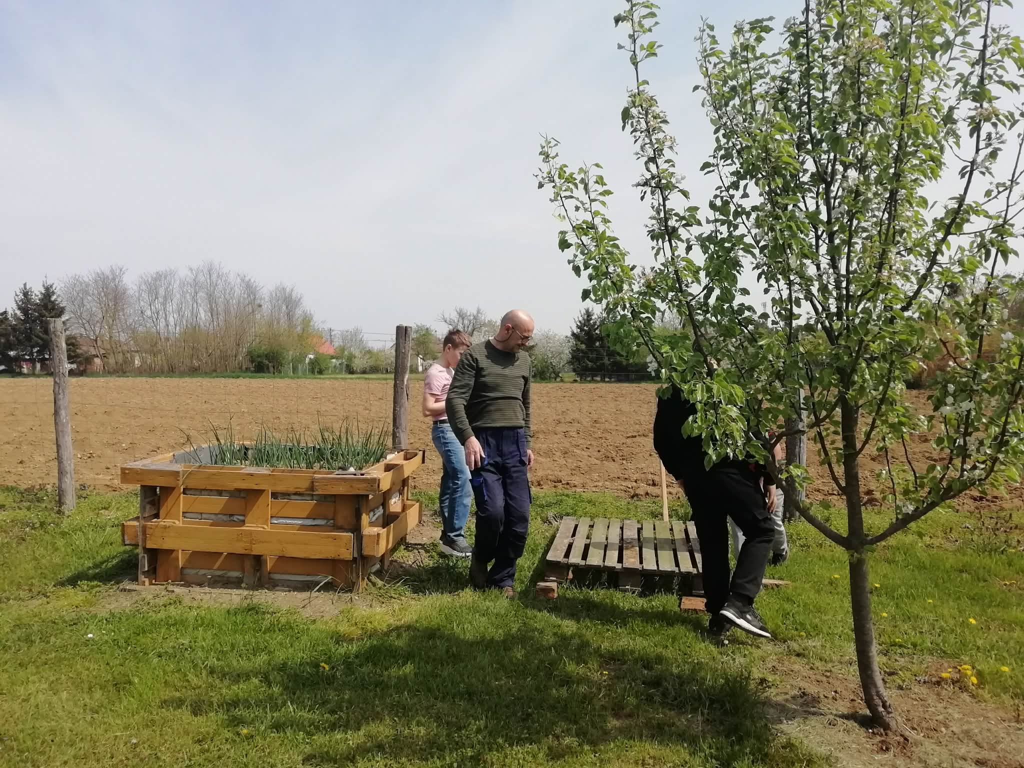 Diákjaink megkezdték a munkát nevelőik és segítőik irányításával. Várja már az esőt minden: sütőtök, zöldborsó, hagyma, paradicsom, eper, málna, a fűszernövények és a gyümölcsfák.